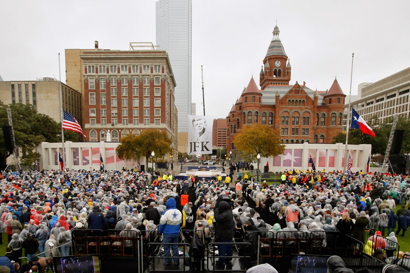 On Friday, November 22, 2013, people gathered before a ceremony to mark the 50th anniversary of the assassination of John F. Kennedy at Dealey Plaza in Dallas and I was thrilled to have my artwork prominently displayed on the banner at the center of the event. It was such a great honor for me to have been asked to have my artwork featured at such an event.